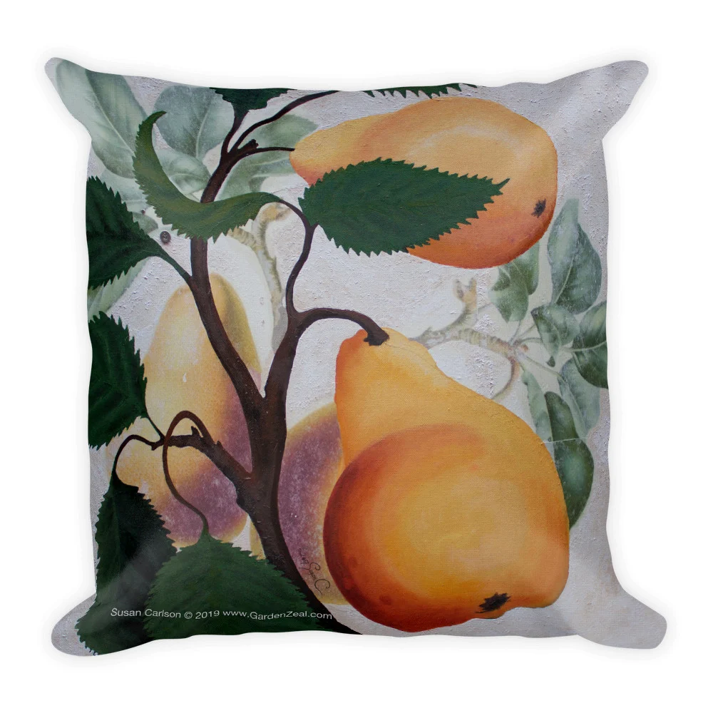 The Pretty Pears featured on this premium pillow are painted by artist, Susan Carlson. She is the creator of Ruby Charms Colors, artful illustrations for coloring enthusiasts. Susan has partnered with GardenZeal to share some of her gorgeous garden and nature designs on home decor, accessories, apparel and gift items.