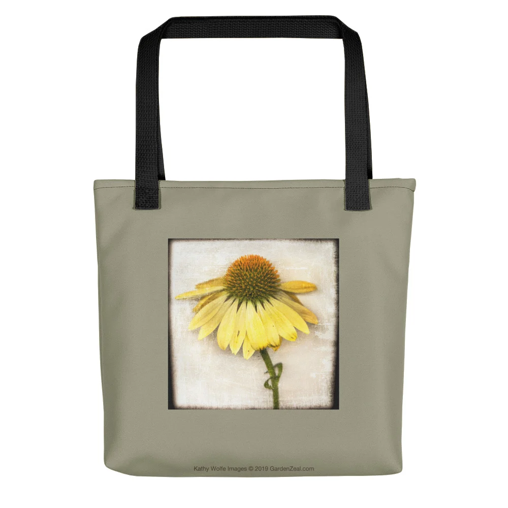This Soft Green Medium Tote bag features a Harvest Moon Cone Flower from Kathy Wolfe Images. An award-winning, Atlanta artist, Kathy has partnered with GardenZeal to share some of her unique images on home decor, accessories, apparel and gift items.