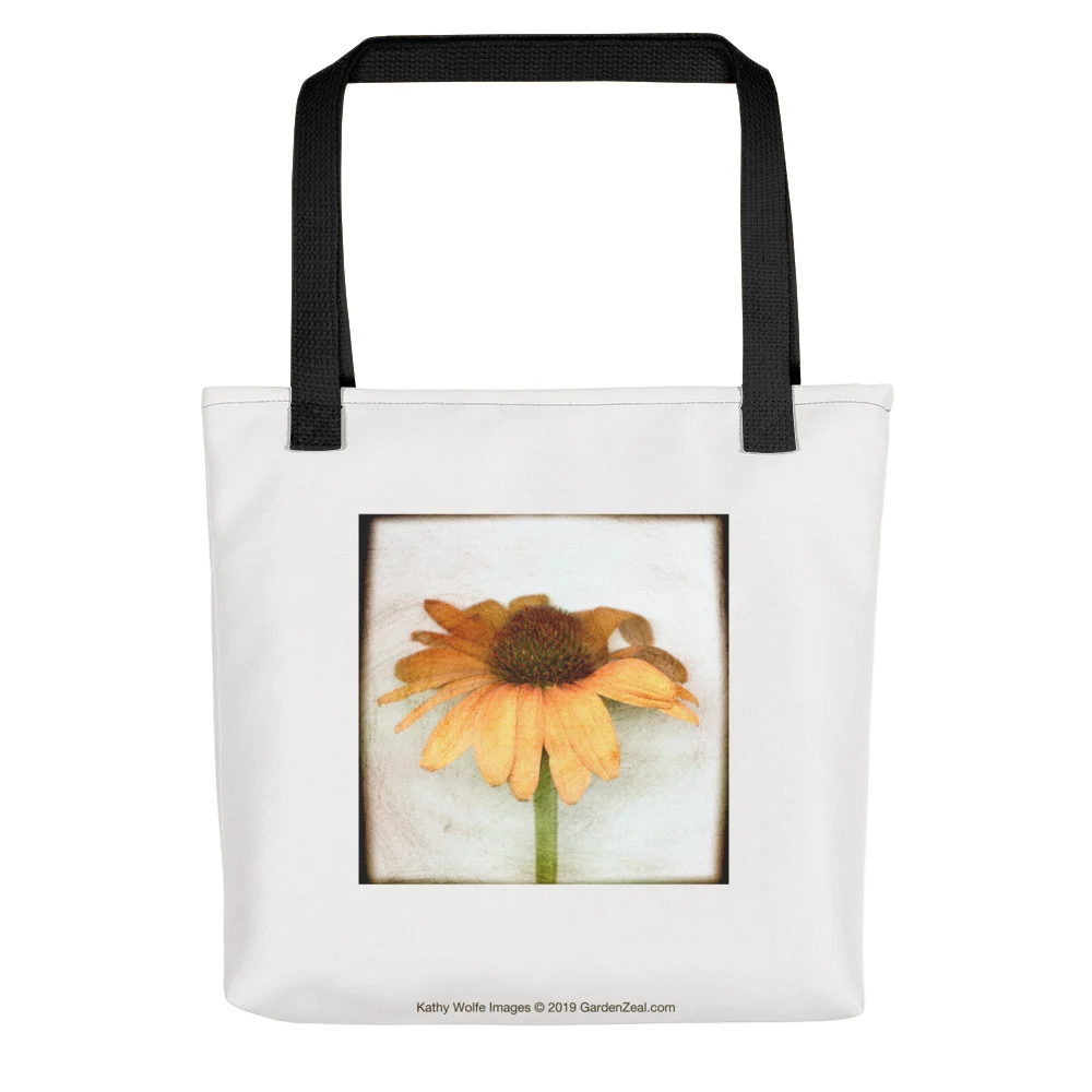 This Warm White Medium Tote Bag features an Orange Cone Flower  from Kathy Wolfe Images. An award-winning, Atlanta artist, Kathy has partnered with GardenZeal to share some of her unique images on home decor, accessories, apparel and gift items.