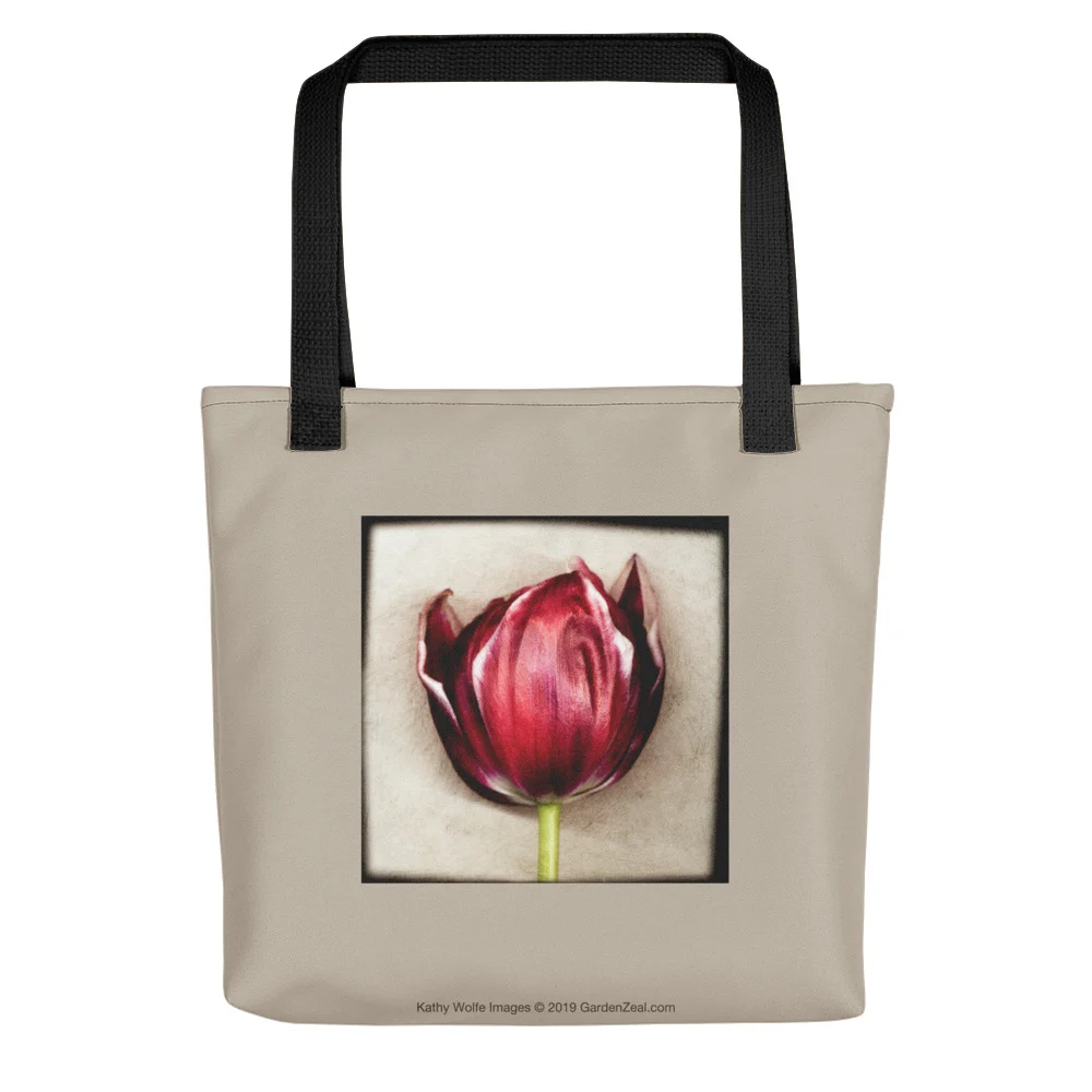 This Latte Colored Medium Tote Bag features a Red Tulip from Kathy Wolfe Images. An award-winning, Atlanta artist, Kathy has partnered with GardenZeal to share some of her unique images on home decor, accessories, apparel and gift items.