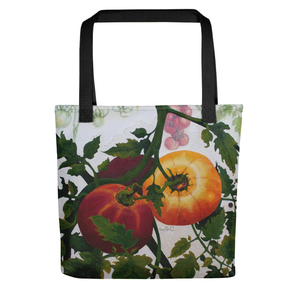 The Terrific Tomatoes featured on this Medium Tote Bag are painted by artist, Susan Carlson. Susan. Susan is the creator of Ruby Charms Colors, artful illustrations for coloring enthusiasts. She has partnered with GardenZeal to share some of gorgeous garden and nature designs on home decor, accessories, apparel and gift items.
