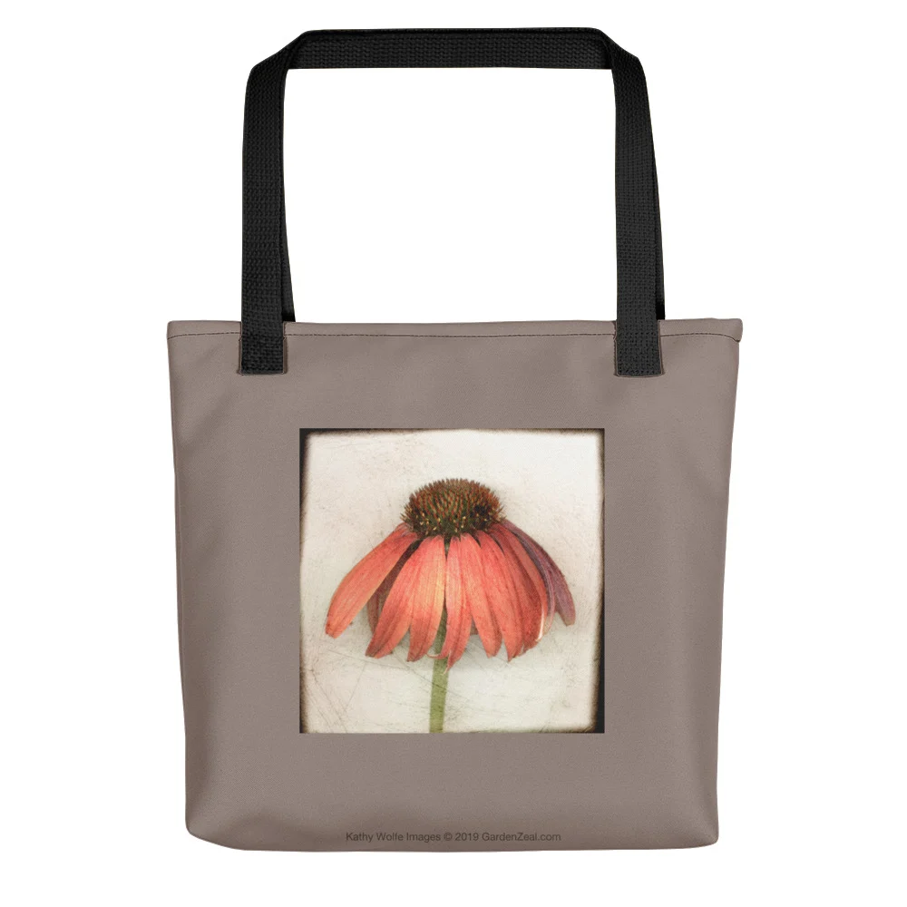 This Taupe Medium Tote Bag features a Tomato Soup Cone Flower from Kathy Wolfe Images. An award-winning, Atlanta artist, Kathy has partnered with GardenZeal to share some of her unique images on home decor, accessories, apparel and gift items.